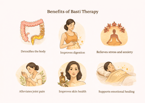 Basti therapy helps remove toxins from the intestines, promotes better digestion, eliminates constipation, and improves nutrient absorption.